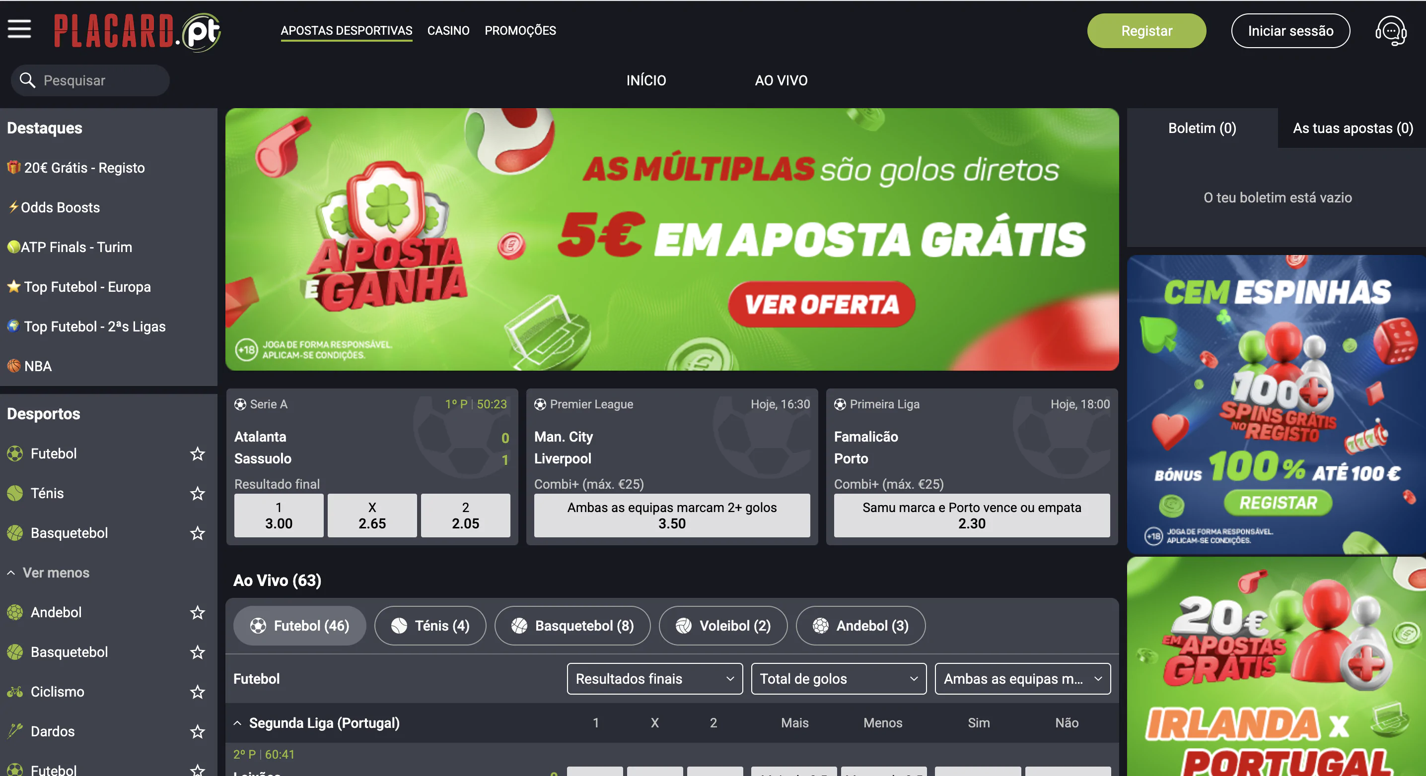 No topo da área central do site, podemos ver as principais ofertas que o Placard disponibiliza. É muito comum a marca oferecer um valor monetário em apostas grátis, tal como se pode ver na imagem. Neste caso, em apostas múltiplas, a marca oferece 5€ de apostas grátis. Ainda na área central, a marca coloca em destaque os atalhos para algumas apostas do dia, associadas aos principais jogos que vão acontecer. Por baixo, surge também uma tabela com vários filtros com os vários eventos que estão a acontecer. É possível ainda aplicar um filtro para ver os eventos que estão a acontecer Ao vivo.